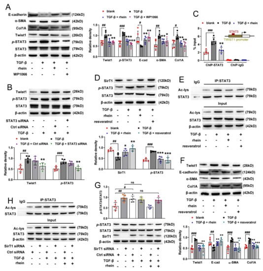 Rhein inhibits Twist1 expression by regulating SirT1/STAT3 pathway. (A) Protein expressions of Twist1, p-STAT3, E-cadherin, α-SMA and Col1A in RTE cells incubated with 10 ng/mL TGF-β and 50 μmol/L rhein or 2 μmol/L WP1066 for 24 h. (B) Protein expressions of Twist1 and p-STAT3 in RTE cells incubated with 10 ng/mL TGF-β after STAT3 transfection. (C) ChIP assay for STAT3 and Twist1 in RTE cells incubated with 10 ng/mL TGF-β and 50 μmol/L rhein for 24 h. RTE cells were incubated with 10 ng/mL TGF-β and 50 μmol/L rhein or 10 μmol/L resveratrol for 24 h, (D) protein expressions of SirT1 and p-STAT3; (E) protein expression of acetylated STAT3 (n = 4); (F) protein expressions of Twist1, E-cadherin, α-SMA and Col1A. After SirtT1 transfection, RTE cells were incubated with 10 ng/mL TGF-β and 50 μmol/L rhein for 24 h, (G) protein expressions of SirT1 and p-STAT3; (H) protein expression of acetylated STAT3 (n = 4). Data were expressed as mean ± SD (n = 5). # p < 0.05, ## p < 0.01, ### p < 0.001, vs. blank cells; * p < 0.05, ** p < 0.01, *** p < 0.001, vs. TGF-β-induced cells.