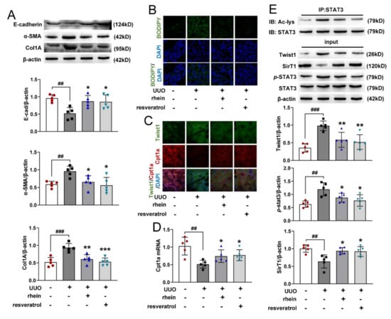 Rhein promotes Cpt1a-mediated FAO via SirT1/STAT3/Twist1 pathway in UUO-induced rats. Rat UUO operation was in the same manner as in Figure 1. The rats were i.g. administered with or without rhein at 100 mg/kg or resveratrol at 20 mg/kg per day from days 1 to 14, (A) protein expressions E-cadherin, α-SMA and Col1A of kidney samples; (B,C) representative images of kidney samples stained with BODIPY and immunostained with Cpt1a and Twist1 (×630, n = 3); (D) mRNA expression of Cpt1a; (E) protein expressions for Twist1, SirT1, p-STAT3 and acetylated STAT3. Data were expressed as mean ± SD (n = 5). ## p < 0.01, ### p < 0.001, vs. sham rats; * p < 0.05, ** p < 0.01, *** p < 0.001, vs. UUO rats.