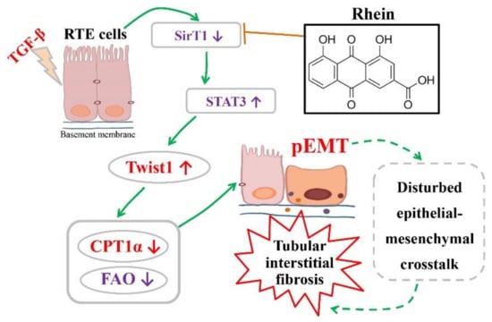 STAT3 mediates TGF-β1-induced Twist1 expression leading to prostate cancer invasion [31]. In this study, we found that both STAT3 inhibitor and silencing STAT3 could downregulate TGF-β-induced high expression of Twist1 in RTE cells. Moreover, ChIP experiment demonstrated that STAT3 activates the transcription of Twist1 mRNA by directly binding to the Twist1 promoter (Figure 5C). These results suggested that STAT3 is an upstream regulator of Twist1 and is required for Twist1 expression. SirT1 is a NAD+-dependent deacetylase. There is an inverse relationship between SirT1 and the TGF-β signaling pathway in renal fibrosis, and SirT1 has the effect of counteracting renal fibrosis [32]. STAT3 activity is inhibited by SirT1-mediated deacetylation in hepatocytes [23]. In this study, we found that TGF-β decreased the expression of SirT1 and increased the activation of STAT3 in RTE cells, and both rhein and SirT1 activator could reverse the effect of TGF-β (Figure 5D,E). Moreover, silencing SirT1 in RTE cells resulted in a significant increase in the lysine acetylation and phosphorylation of STAT3 (Figure 5G,H), indicating that STAT3 is regulated by SirT1-mediated deacetylation. Therefore, our in vitro and in vivo studies have demonstrated that Twist1 transcription is adjusted by SirT1/STAT3 pathway, and Twist1 is essential for Cpt1a-mediated FAO dysfunction. Rhein could improve renal fibrosis, at least in part, by regulating this pathway. Twist1 negatively adjusts Cpt1a. Cpt1a inhibition causes FAO dysfunction, which leads to EMT of RTE cells. According to the hypothesis of “pEMT” [9], the pEMT cells lead to a disordered crosstalk with mesenchymal cells, which will lead to tubular interstitial fibrosis (Figure 7).