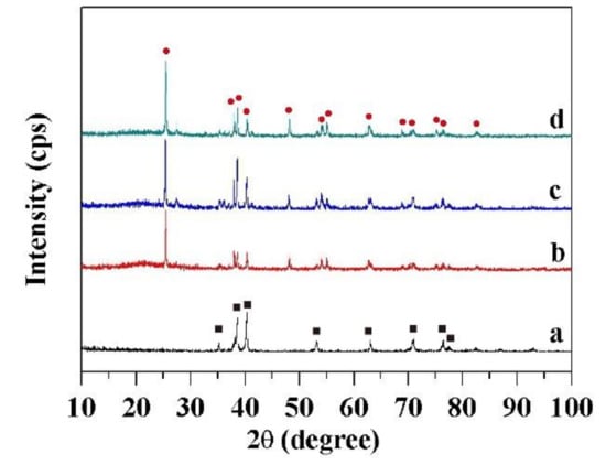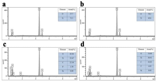 In the 2θ scan range 10°–100°, all show characteristic peaks of Ti(100), Ti(002), Ti(101), Ti(102), Ti(110), Ti(103), Ti(112), and Ti(201) at 35.1°, 38.4°, 40.2°, 53.0°, 62.9°, 70.6°, 76.2°, and 77.3°, respectively. These data for the pristine (a) are in good agreement with the Ti crystallographic data (Reference code:00-001-1198). In comparison, all show characteristic peaks of TiO2(101), TiO2(103), TiO2(004), TiO2(112), TiO2(200), TiO2(105), TiO2(211), TiO2(204), TiO2(116), TiO2(220), TiO2(107), TiO2(301), and TiO2(312) at 25.3°, 36.9°, 37.8°, 38.6°,48.0°, 53.9°, 55.1°, 62.7°, 68.8°, 70.3°, 74.1°, 76.0°, and 83.1°. The 13 peaks are due to the formation of Ti oxides in the crystalline phase, which are in accordance with the TiO2 crystallographic data (Reference code:03-065-5714). Although the presence of crystal structures is not a differentiated factor for the hydrophobicity or hydrophilicity of the surfaces, a significant difference was obviously found between the pristine Ti surface (a) and other three Ti surfaces with nano TiO2 particles in Figure 3b–d.