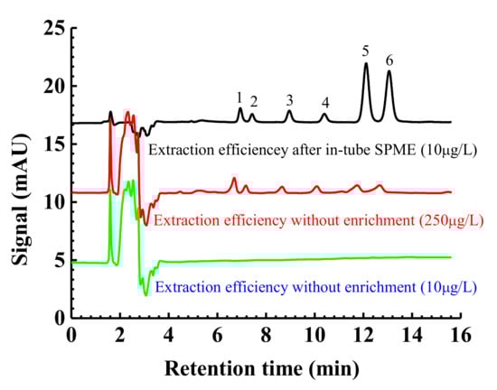 Based on the above discussion, the optimal conditions of in tube SPME for estrogens are: 60 mL sampling volume, 2 mL sampling rate, 2 min desorption time at a flow rate of 1 mL/min. Under the optimized extraction conditions, the expected extraction performance of superhydrophilic wire (b) for the target analytes was achieved. As shown in Figure 8, the estrogen analytes were not detected for the direct injection of a sample spiked at 10 μg/L. After the concentration of each estrogen compound increased to 250 μg/L, some small peaks of the six estrogens appeared. Compared with the signals after the extraction by the proposed in-tube SPME method, chromatographic peaks become very obvious, especially for diethylstilbestrol and hexestrol. A higher extraction efficiency indicated that there were abundant multiple interactions between the superhydrophilic wire (b) and the target analytes.