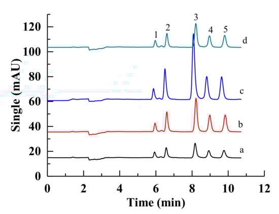Chromatograms of the target compounds using four kinds of fibers (a, b, c, d) with different surface wettability. The concentration of each compound of PAHs is 10 μg/L. Peak identification: 1. naphthalene, 2. acenaphthylene, 3. acenaphthene, 4. phenanthrene, 5. Anthracene. Water/acetonitrile (25:75, v/v), Detection wavelength, 226 nm. Other conditions are the same as Figure 6.