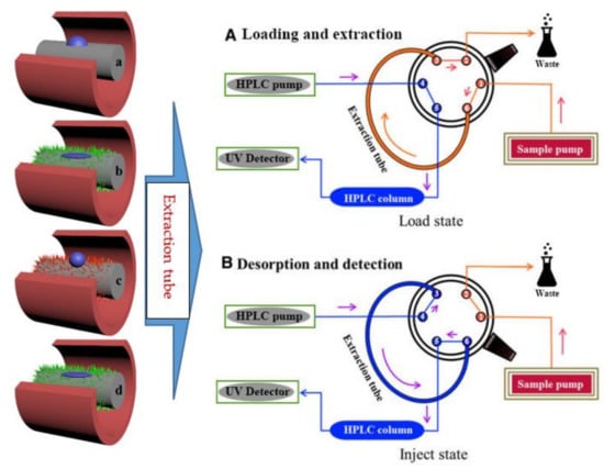 As shown in Figure 10(left), the extraction tube was connected to the six-port valve instead of the sample loop. The six-port high pressure valve was switched between the load and inject states to perform the extraction and desorption processes. In the load state, the sample solution was transported through the extraction tube via an EasySep-1020LC pump, and the target analytes were adsorbed by the selected wire. The sample was pumped and flushed from pore 1 to pore 6, then pressured into the extraction tube and entered pore 3. After the preconcentrated target compounds in sample were continually entrapped by the extraction materials, the remaining solution was flushed to the waste bottle from pore 2. After the rotor was rotated about 60°, the system changed to the injection state. In this case, the mobile phase flowed through the extraction tube from pore 4 to pore 3, the absorbed target compounds were desorbed by the mobile phase, and the mobile phase with the desorbed compounds was pumped to the separation column from pore 6 to pore 5 for UV detection, consequently. The extraction and the desorption could be completed by the switch between the load and inject modes in Figure 10(right).