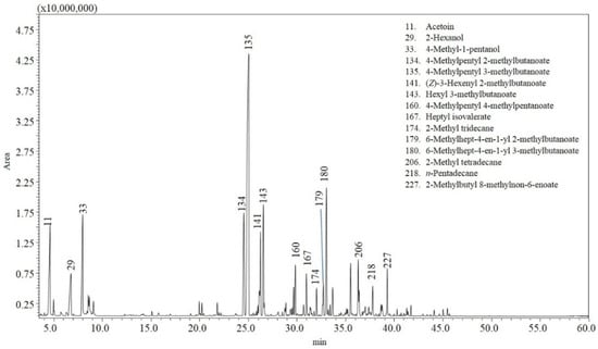 The analyzed chili samples displayed different gas chromatography–mass spectrometry (GC-MS) chromatograms. Figure 1, Figure 2 and Figure 3 show an example of a chromatogram for each variety. More than two hundred and fifty compounds were identified in total in the different samples, accounting for 87–91% of the total composition (Table 2 and Table S1 from Supplementary Materials). Table 2 reports volatile compounds with a percentage area greater than 0.5% in at least one of the chili peppers samples analyzed, and Table S1 from Supplementary Materials reports the other volatile compounds with a percentage area less than 0.5%.