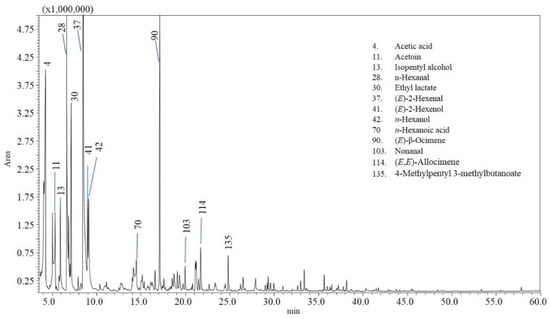 Volatile organic compounds (VOC) are commonly correlated with food flavor and fragrance, and their determination is important to evaluate food quality, authenticity, purity, and origin []. Methyl and ethyl esters, for example, provide strong fruity notes in foods, whereas terpenes provide woody, floral, fruity, and spicy notes. Aldehydes have a low odor threshold, and the sniffing analysis of Capsicum reported their presence as green, cucumber, pungent, or herbaceous odor notes [,].