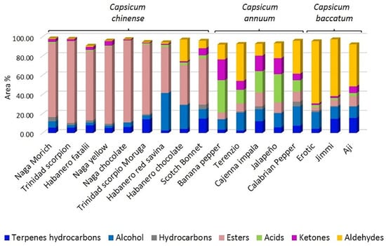 Among the analyzed C. chinense samples, Habanero red savina, Habanero chocolate, and Scotch bonnet showed a lower content of esters and a greater amount of alcohols and aldehydes (Figure 4). It has been demonstrated that ester biosynthesis is limited by alcohol concentration, which can modify the content of esters in specific cultivars []. In the analyzed species, even if there is good alcohol availability, the production of the esters is probably inhibited by the absence of free fatty acids.
