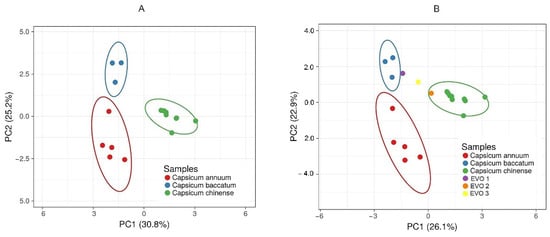 As shown in Figure 5A, the PCA score plot in the space of the two PCAs explains 56.0% of the total variance, only considering the peppers, and 49.0% of the total variance, also considering the oils (Figure 5B). This confirms the applicability of the built model and the other unknown samples. From Figure 5, it is clear that at positive values of PC1 and negative values of PC2, the Capsicum baccatum species is well separated, whereas the Capsicum annuum is present at negative values of PC1 and PC2. Furthermore, the Capsicum chinense species is separated well on PC1 in the positive region. As far as the PC2 shown in Figure 5B is concerned, it is interesting to notice that the extra virgin olive oils EVOO1 (containing Merkén pepper, a smoked Aji chili pepper belonging to Capsicum baccatum) and EVOO2 (containing a mix of the Capsicum chinense pepper) are correctly grouped with the peppers used as a flavoring in the producing process. Since the EVOO3 samples were flavored with a mix of Capsicum belonging to different species, it is not possible to insert them into a specific group. Table S4 from Supplementary Materials lists the compounds that mainly influence the plot and their contribution to PC1 and PC2.