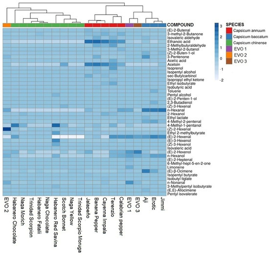 The cluster analysis based on the patterns of the most abundant volatiles instead showed good separation of C. chinense from the C. annuum and C. baccatum group (Figure S2 from Supplementary Materials).