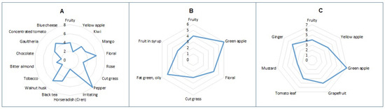 Aroma profile of three different species of pepper chosen as example from descriptive sensory analysis on line scale (n = 10). Panel (A) shows sample 1 (Naga Morich, Capsicum chinense); panel (B) shows sample 14 (Calabrian pepper, Capsicum annuum); and panel (C) shows sample 17 (Aji, Capsicum baccatum).