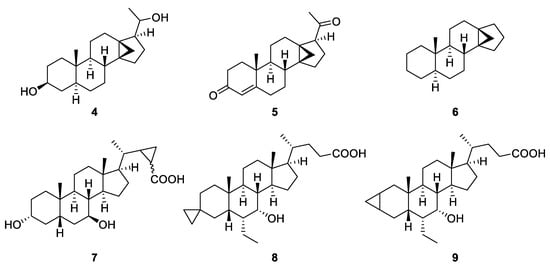 - Hora, J.; Cerny, V.; Sorm, F. On Steroids.70. Cyclopropane Ring Formation on Deamination of 18-Amino Steroids. Collect. Czechoslov. Chem. Commun. 1962, 27, 2771–2777. [Google Scholar] [CrossRef]