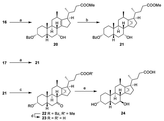 Synthesis of the 7-oxo and epimer analogues of the cholic acid-derived propellane: (a) BzCl, Pyr, toluene, 2 h; 93% (16→20); 94% (17→21); (b) Et2Zn, CH2I2, CH2Cl2, reflux, 4 h, 76%; (c) PCC (15 equiv.), CH2Cl2, 2 h, 95%; (d) NaOH, MeOH/H2O, then HCl, 75%; (e) Na(s), i-PrOH, 100 °C, 18 h, 21%.
