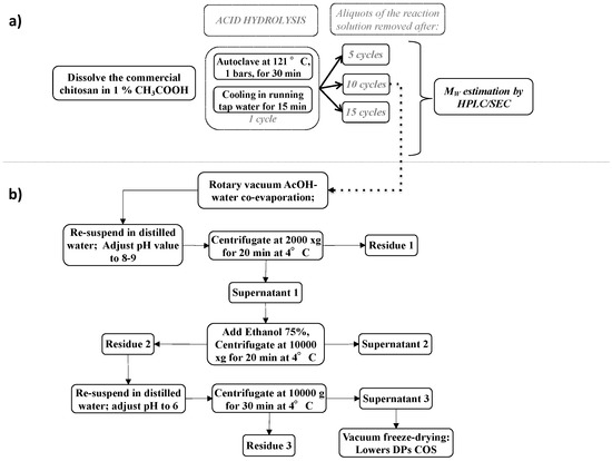 The downstream process consisted of a first step of vacuum evaporation of the acetic acid, followed by adjustment of the pH to 8–9 with NaOH (1 M), allowing the nonhydrolyzed chitosan to be removed by centrifugation (2000× g, 20 min at 4 °C). The supernatant was then precipitated by 75% EtOH (7 v/v) and COS were collected by centrifugation (10,000× g, 20 min at 4 °C). The residue was washed in 75% EtOH in order to eliminate all traces of acetic acid. The final step consisted of solubilizing COS in distilled water, adjusting the pH to 6, and freeze-drying the supernatant obtained after centrifugation (10,000× g, 30 min at 4 °C). COS were obtained as a brownish powder. A HPLC/SEC analysis of COS oligosaccharides was performed according to the method described in a previously published study [38].