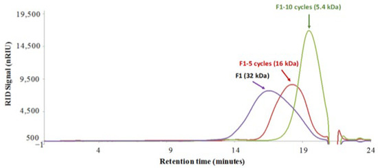 Generally, high concentrations of hydrochloric acid (0.5–2 M) and higher temperatures (100–121 °C) associated with high pressure (1–2 bars) are most commonly used to increase the levels of chitosan depolymerization. In the present study (Figure 1a), the fungal chitosan (F1) was dissolved at 2% (w/v) in 1% (v/v) acetic acid and subjected to 5 to 15 autoclaving/cooling cycles of 30 min each at 121 °C (1 bar) with a 15 min temperature ramp-up and a 15 min ramp-down for each thermal cycle, according to a modified protocol of No et al. [44]. To determine the Mw distribution of F1 after thermal treatment, aliquots from each experimental conditions were collected, and the resulting products of degradation were characterized using high-performance liquid chromatography size exclusion chromatography (HPLC/SEC) [38].