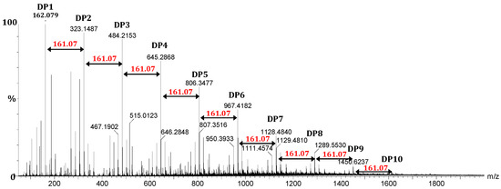 Figure 3 is a representative ESI-HRMS spectrum of chitosan oligomers produced during the acid hydrolysis process. The analysis was performed in positive ion mode, showing mainly the [M+H-H2O]+ions of the different oligomers (from DP1 to DP10) obtained following in-source spontaneous water loss. The mass difference of 161.07 Da between the two consecutive DP ions corresponded to the residual mass of the repeating glucosamine unit (C6H11O4N), clearly identifying chitosan oligosaccharides (COS). The spectrum also reveals that the chitosan oligomers fraction was mainly composed of fully deacetylated COS with DPs from 2 to 10. The mass of the major singly charged molecular ion was calculated to be [161.07n + [1.00 (H) + 17.00 (OH)] (mass of reducing end residue) + 1.00 (H)]−MH2O Da respectively, where n is the number of GlcN units (corresponding also to DP, as reported in Supplementary Data Table S1). Table S1 (m/z of the COS ion) was created based on unacetylated COS, corresponding to the major species. The presence of COS containing acetyl groups is illustrated for the DP3 mass spectrum region in Supplementary Figure S1. Indeed, the ion at m/z 544.2352 and 526.2244 match the [M+H]+ and [M+H-H2O]+ ions of a DP3 bearing one acetyl group.