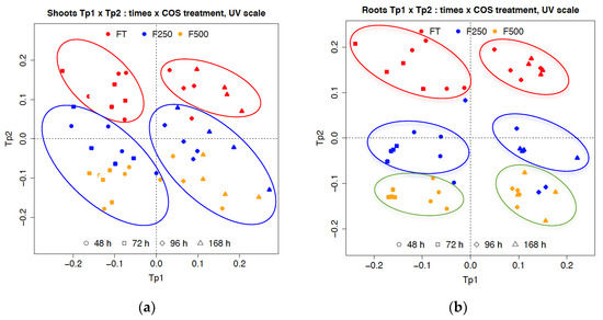 Figure 5a,b represent the AMOPLS score plots for data acquired in MS negative ion mode corresponding to the UPLC retention time range between 0.5–5.5 min. The score of the first predictive component was associated with the time effect (Tp1), whereas the second predictive component (Tp2) was linked to response to treatment with COS oligosaccharides. Considering these two principal components, we explained the variance in shoots as follows: COS concentration treatment 13%, time 31% and interaction COS concentration treatment–time 15% (Figure 5a). Similar results were obtained for roots samples: COS concentration treatment 16%, time 31% and interaction COS concentration treatment–time 20% (Figure 5b).