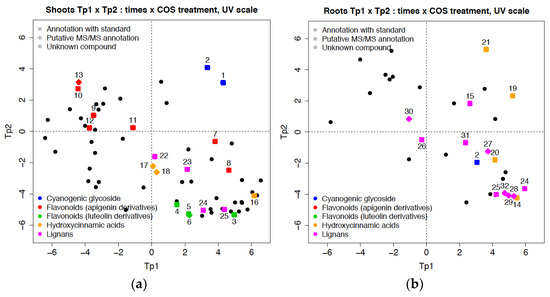 The distinction depicted in the Tp1 and Tp2 parameters resulted from the changes in metabolite levels in the samples (roots and shoots) of controls and COS treated flax seedlings. As observed in Figure 6a, the contribution of metabolites to Tp1 discrimination in shoots was dominated by flavonoid apigenin derivatives (schaftoside isomer (6), vicenin-2 (10)) and cyanogenic glycosides (lotaustralin (2) and linamarin (1)); while other flavonoid luteolin derivatives (carlinoside (5), carlinoside isomer (6), orientin and iso-orientin (3)), (neo)lignans (PMG (23), DCG (24), LMG (25)) and hydroxycinnamics acids (chlorogenic acid (16)) were the major metabolite contributors to Tp2.