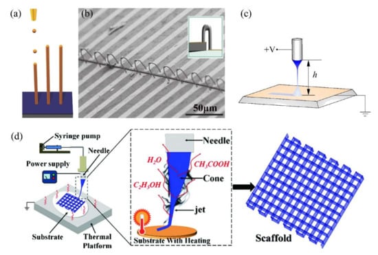 - Li, K.; Wang, D.; Wang, Q.; Song, K.; Liang, J.; Sun, Y.; Madoua, M. Thermally Assisted Electrohydrodynamic Jet High-Resolution Printing of High-Molecular Weight Biopolymer 3D Structures. Macromol. Mater. Eng. 2018, 303, 1800345. [Google Scholar] [CrossRef]