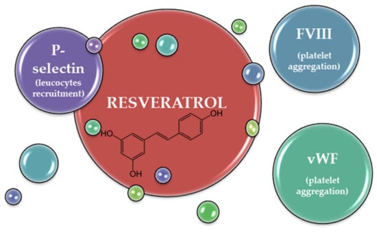 RES also interferes with vascular homeostasis by regulating the coagulation cascade. In particular, in vitro studies in HUVECs (human umbilical vein endothelial cells) demonstrate that it decreases the expression of some thrombosis-associated markers as Von Willebrand factor (vWF), procoagulant factor VIII and P-selectin [94]. COVID-19 patients generally show increased levels of vWF and Factor VIII, which both promote venous thromboembolism (VTE) events [94]. On the other hand, P-selectin facilitates the migration of leukocytes to the damaged site promoting their interaction with platelets [94].