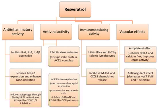 The importance of RES is also due to its role as an anti-inflammatory agent since it promotes autophagy [38] and inhibits the expression of pro-inflammatory agents, such as IL-6, IL-1β and IL-8 interleukins, decreasing the inflammatory process caused bySARS-CoV-2 infection [62,63].