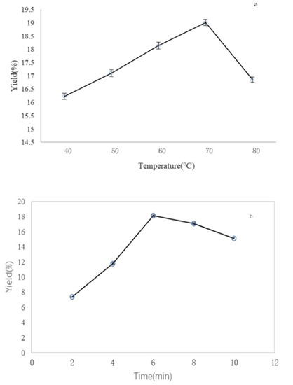 The extraction process was performed at different temperature conditions (40, 50, 60, 70, and 80 °C) while other extraction variables were set as follow: extraction time of 6 min, extraction pressure of 10 MPa, and number of cycles of 2. As shown in Figure 1a, the crude polysaccharide yield reached a maximum at the temperature of 70 °C and then started to reduce. This tendency was consistent with the study of other authors in extracting polysaccharides [21,27]. This revealed that temperature enhanced the crude polysaccharide extraction from chestnut mushroom into the water to a certain level followed by their possible loss, due to decomposition at a higher temperature.