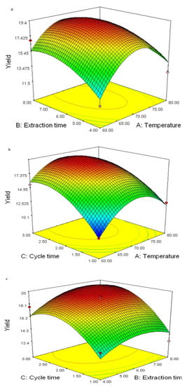 Response surface plots showing the interaction effects of extraction time and extraction temperature (a), number of cycles and extraction temperature (b), and number of cycles and extraction time (c) on the yield of crude polysaccharide.
