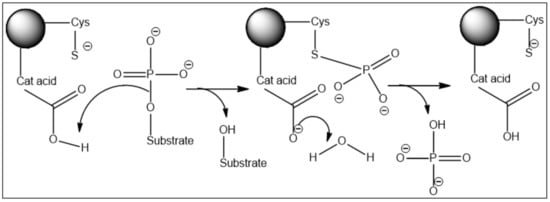 The active site contains two key catalytic residues, an unprotonated thiolate and a protonated catalytic acid. The phosphoryl group of the substrate is cradled by the active site loop, forming hydrogen bonds to the backbone amides and the arginine of the HCX5R motif. The thiolate anion of the catalytic cysteine lies directly below the phosphoryl group, which sets up an in-line attack of the thiolate on the P-O bond in the first chemical step of the reaction. The departure of the leaving group and formation of the phospho-cysteine intermediate are facilitated by the protonation of the oxyanion by the catalytic acid (still unknown) located in a separate loop. In the second chemical step of the reaction, water serves as a nucleophile in the hydrolysis of the phospho-enzyme intermediate assisted by the aspartate (Figure 1) [6].