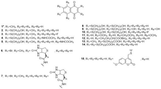 Menadione (vitamin K3) (1) is one of the first para quinoid compounds that proved its activity against Cdc25 A, B, and C (Ki: 38 ± 4, 95 ± 3, and 20 ± 4 µM, respectively). Suggestions to modify the structure by delivering polar derivatives of this nucleus did not lead to increased activity in contrast to what was expected [10,11].