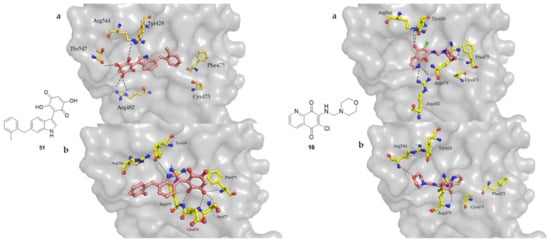 The indolyldihydroxyquinones group was synthesized as isosteric analogs of paraquinoid. The best derivative was 51 with reversible inhibitory activity (IC50 of 1.0, 1.0, and 3.5 µM) against Cdc25 A, B, and C, respectively [59] (Figure 6).