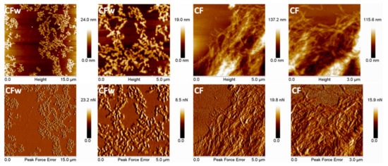 AFM topographic and peak force error (PFE) images of CFw and CF are shown in Figure 1. The two types of fibers have different aspects and dimensions. Their average width calculated by the NanoScope 1.20 software is almost double in the case of CFw compared to CF, i.e., 70 ± 8 nm for CFw and 37 ± 8 nm for CF. Although the real widths of cellulose fibers are probably smaller than the measured ones, due to the AFM tip widening effect [33], the ratio between their widths is high. The length of the two types of fibers is also largely different, the aspect ratio of CFw being close to 2.5 and that of CF approaching 10; therefore, four times higher. The small length of CFw is a result of the mechanical treatment by ball milling for a long period of time (three cycles of 8 h each), which led to a significant reduction of both the width and length of the fibers [34].