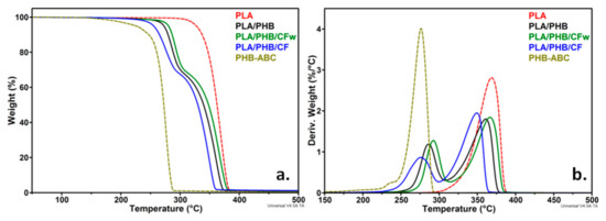 TGA and derivative curves for PLA, ABC-plasticized PHB (PHB-ABC), PLA/PHB blend, and biocomposites (PLA/PHB/CFw, PLA/PHB/CF) are shown in Figure 2. The temperature at 5% weight loss (T5%), along with the temperature of the maximum decomposition rate of PHB (Td-PHB) and PLA (Td-PLA), are presented in Table 2.