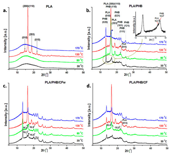 The dependence of the crystalline structure of the PLA, PLA/PHB blend and the biocomposites on temperature was analyzed by in situ high-temperature XRD. The samples were heated from room temperature to 170 °C with 10 °C/min, and the diffractograms at 30, 80, 130, and 170 °C are shown in Figure 4. These temperatures were selected based on the events observed in the DSC thermograms. The PLA was amorphous at 30 and 80 °C, but it crystallized at 130 °C (Figure 4a). The characteristic peaks of the α-form of PLA were observed at 2θ = 14.7, 16.5, 18.8, and 22.0°, corresponding to the lattice planes (010), (200)/(110), (203), and (015) [10,41].