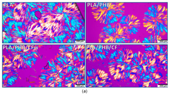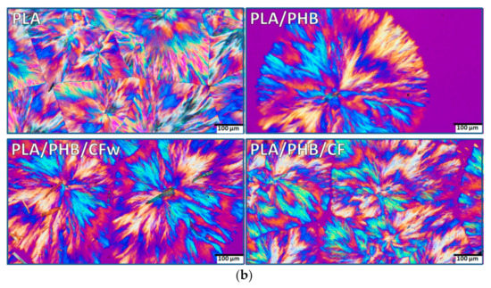 In the PLA/PHB blend, the alternate optical blue/orange birefringence stripes are better defined and the crystalline structure appears to be more regular (Figure 5a,b–PLA/PHB). In addition, the size of the spherulites is reduced to 400–600 μm. This is an effect of both PHB, acting as a nucleating agent, and of the ABC plasticizer [21]. The addition of cellulose fibers, CFw or CF, led to a further decrease in spherulites’ size to 300–500 μm, with an average dimension around 400 μm (Figure 5a,b—PLA/PHB/CFw and PLA/PHB/CF). This confirms their nucleating effect. Impinged spherulites were frequently observed in each biocomposite. It should be noted that micron-sized fibers were frequently noticed in the PLA/PHB/CFw biocomposite, while only rarely seen and difficult to distinguish in the PLA/PHB/CF. The results related to the different fibers sizes are due to the different applied treatments: mechanical treatment for the preparation of CFw and acid hydrolysis treatment in the case of CF.