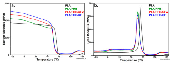 Storage modulus (a) and loss modulus (b) of PLA, PLA/PHB and biocomposites against temperature.