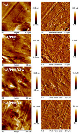 A completely different surface morphology was noticed in the case of PLA/PHB/CF (Figure 8). Interconnected networks of fibrils were observed, as marked with arrows. These may come from the crystalline structures of PHB or from the cellulose fibers. XRD patterns showed a lower crystallization tendency in PLA/PHB/CF at room temperature, compared to the other samples, and DSC showed a lower crystalline degree in this case; therefore, the fibrils network observed in the AFM images is likely composed of CF-type cellulose fibers. The good dispersion of large aspect ratio CF observed by AFM may also explain the good mechanical properties highlighted by DMA in the case of PLA/PHB/CF.