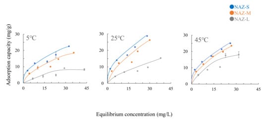 : adsorption; □: desorption; adsorbent: NAZ-S, NAZ-M, and NAZ-L.