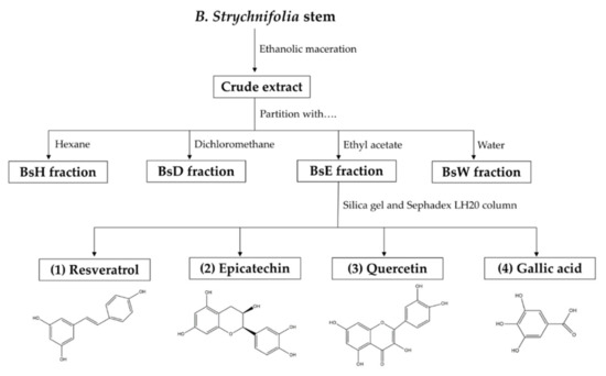 A total of 900 g of B. strychnifolia powder were macerated with 95% ethanol at RT for three days in triplicates. Subsequently, pooled ethanolic macerates were filtrated through filter papers, evaporated with a rotary evaporator at 50 °C, and freeze-dried to get crude extract. After that, 80 g of aliquoted crude extract were dissolved in 10% methanol and sequentially partitioned with hexane, dichloromethane, ethyl acetate, and water, respectively. Each partitioned solvent was then filtrated, evaporated, and freeze-dried to obtain hexane (BsH), dichloromethane (BsD), ethyl acetate (BsE), and water (BsW) fractions.