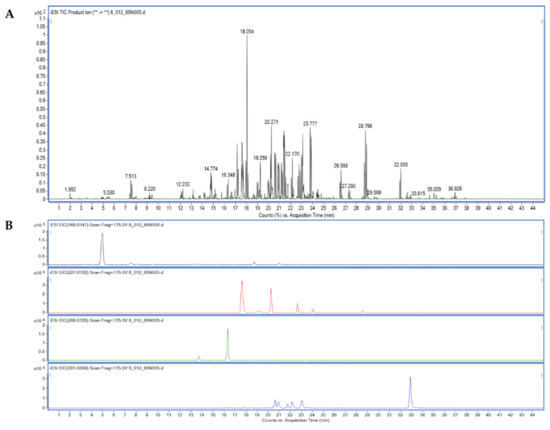 Phenolic and flavonoid compounds in BsE fraction were identified by liquid chromatograph–quadrupole time-of-flight mass spectrometer (LC-QTOF MS, Agilent Technology, Santa Clara, CA, USA). The chromatographic separation was run on a Zorbax Eclipse Plus C18 column (150 × 2.1 mm, particle size 1.8 µm) at 25 °C. The injection volume was 2 µL, and the flow rate was kept at 0.2 mL/min. Elution was carried out by using two mobile phases: eluent A (0.1% formic acid in water) and eluent B (acetonitrile). The gradient program was as follows: 5% B (3 min), 23% B (22 min), 35% B (10 min), and 5% B (10 min).