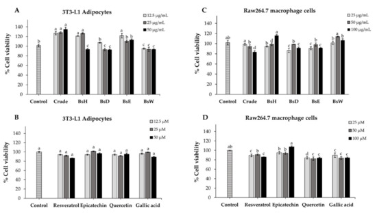 The percentage of cell viability of 3T3-L1 adipocytes (A,B) and raw264.7 macrophage cells (C,D) after treatment with different concentrations of crude extract, partitioned fractions, and isolated compounds. Values are expressed as the means ± SD (n = 3). Different letters (a–d) indicate statistical difference (p < 0.05).