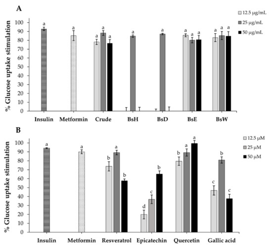 The percentage of glucose uptake stimulation in 3T3-L1 adipocytes after treatment with various concentrations of crude extract (A), partitioned fractions (A), and isolated compounds (B). Insulin (100 nM) and metformin (2 mM) were used as the positive control. Results are expressed as mean ± SD (n = 3). Different letters significantly indicate difference (p < 0.001).