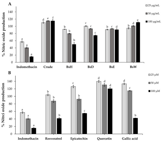 The percentage of nitric oxide production in LPS-induced Raw264.7 macrophage cells after 24 h of incubation with crude extract (A), partitioned fractions (A), and isolated compounds (B). Indomethacin was used as a positive control. Data are expressed as mean ± SD (n = 3). Different letters indicate a lack of significant difference (p < 0.001).