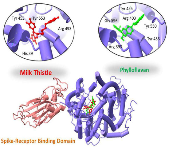 Two-dimensional maps of these interactions were analyzed using the MOE LigX tool. ChimeraX was used to display docked complexes. The LigX interaction diagram showed that Phylloflavan and Milk thistle were found to bind with the spike receptor binding domain protein with a score of −14.09 kcal/mol and −13.10 kcal/mol, forming hydrogen bonds and other interactions with the side chains of Tyr 455, Tyr 550, Arg 393, Gly 596, Tyr 453 and Arg 403 (Phylloflavan), and Tyr 453, Tyr 553, Arg 493 and His 39 (Milk thistle), as shown in Figure 2.