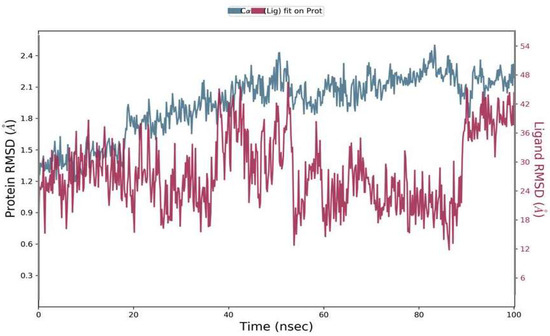 The RMSD was calculated during 100 ns simulations for the top complex. The RMSD was used as a function of time for the best ligand (Phylloflavan) with the spike-receptor binding domain protein. The RMSD results revealed that the MD simulation was equilibrated between 1 Å and 1.8 Å (Figure 4). Although it showed stability up to 50 ns, after that it showed minor deviations up to 90 ns; following that, it showed stability again. The RMSD results signified that the spike-receptor binding domain did not undergo large conformational changes. The RMSD plot of ligands in the right y-axis direction suggested that all these ligands were stable during simulation, with respect to the protein binding pocket.