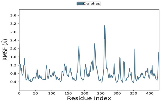 The RMSFs were calculated to examine residential stability and flexibility over 100 ns. Trajectory conformation variability can be modified to compute the RMSFs for individual atoms. Phylloflavan had an average RMSF of 1.2 for overall positions. At the C-terminal and N-terminal, there were significant differences in all trajectories. The complexes’ total residual fluctuations are depicted in Figure 5.