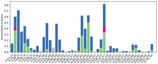 Understanding the binding mechanism of both complexes in the binding pocket of the spike-receptor binding domain necessitates atomic-level knowledge. Hydrogen bonding, ionic interaction, hydrophobic contacts and salt bridges are all essential intermolecular interacting forces in binding mode analysis. Over 100 ns simulation studies, these intermolecular forces of interactions were predicted (Figure 7).