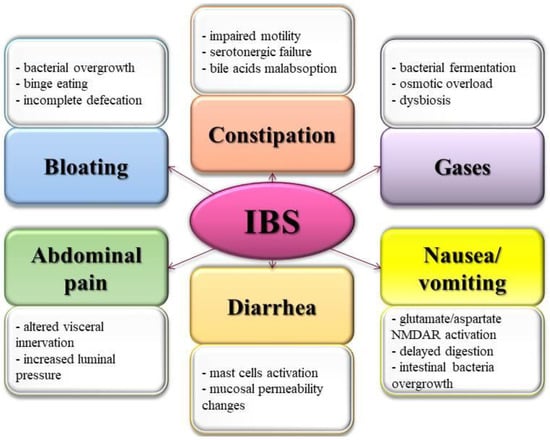 Irritable bowel syndrome currently affects one in every five individuals [8,9]. Despite the patients describing the symptomatology as extremely disturbing, no significant tissue and molecular changes or damage have been reported [10]. Thus, IBS diagnosis is almost exclusively based on clinical symptomatology (Figure 1). In this context, studies have failed to identify an apparent cause of IBS occurrence. Still, the evidence has shown that IBS could result from a complex interaction between the gastroenterological, neurological, and molecular components observed in its pathology, as previously described [11]. Additionally, several key risks and promoting factors were established, one of which is the modern Western diet [12].