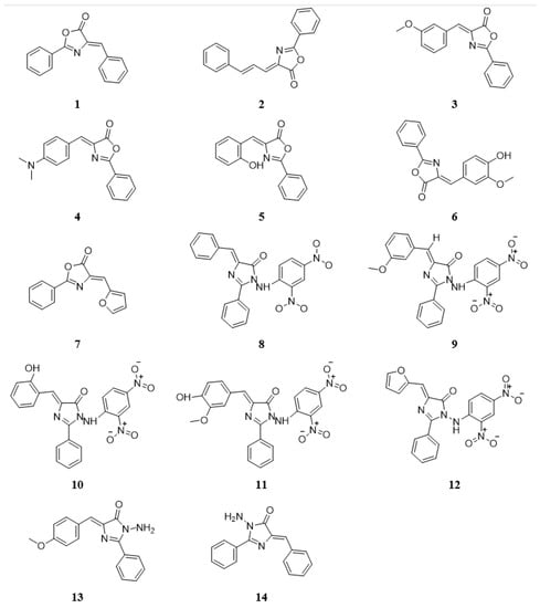 Fourteen new imidazolone (Figure 2) and oxazolone derivatives were synthesized and chemically characterized without investigating their biological activities [22,23]. Therefore, this study focused on exploring the compounds’ in vitro and in silico anti-cancer activities to identify any lead candidate that may be further developed to provide an efficacious and potent selective anti-cancer drug therapy.