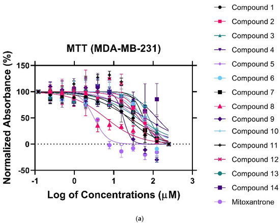 MTT assay of the fourteen (14) synthetic compounds against (a) MDA−MB−321 cancer cell lines, (b) MCF10A cell lines, (c) HCT8 cancer cell lines.