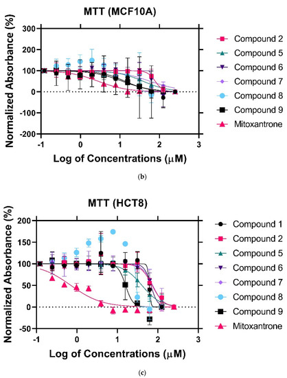 To establish the cytotoxic effect of the nitrogenous derivatives, cells were treated with various concentrations of the drugs ranging from 0 to 250 μM. Following a 24 h incubation period, cell viability was assessed using the MTT assay. Mitoxantrone served as a positive control to evaluate growth inhibition. Since heterogeneity is a hallmark of cancer, the study included cell lines with diverse genomic and proteomic profiles. MDA-MB-231(triple-negative breast cancer) demonstrated a great sensitivity towards compounds 8 and 9, with an IC50 of 4.7 μM and 17.02 μM, respectively (Figure 3a). Meanwhile, the non-malignant breast epithelial cell line (MCF-10A) showed reduced sensitivity towards compound 8 (Figure 3b). The IC50 was six-fold higher than that observed in the MDA-MB231 cells, indicating cytotoxic selectivity, a promising feature needed in any therapeutic anti-neoplastic agent. Compound 9, however, displayed a potent anti-proliferative effect in MCF-10A cells (IC50 = 9.516 μM). In this regard, further optimization would be required to increase the selective therapeutic potential of compound 9. To determine whether the anti-proliferative effect of the nitrogen derivatives could be translated to other malignancies, we tested the cytotoxic effect on the HCT8 (colorectal cancer) cell line. HCT8 is an adenocarcinoma driven by the Kirsten Rat Sarcoma (KRAS) mutation, unlike MCF-10A [28]. However, the cytotoxic effects were comparable to that observed in the MCF-10A (Figure 3c), indicating that the mechanism of the anti-proliferative effect of compounds 8 and 9 in HCT8 could be unrelated to the KRAS pathway. Data are summarized in Table 1.