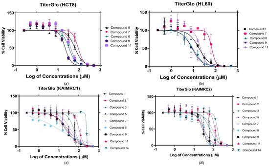 Corroborating the MTT assay results, compounds 8 and 9 displayed a significant anti-proliferative effect after a 24 h treatment in MDA-MB-231 cells, with an IC50 of 18.97 μM and 39.19 μM, respectively (Figure 4). The KAIMRC1 cells demonstrated an increased sensitivity to compounds 8 and 9, with an IC50 of 10.20 μM and 22.18 μM, respectively. Meanwhile, KAIMRC2 also was sensitive to compound 9, with an IC50 of 27.11 μM. Both KAIMRC cell lines displayed differing proteomic phosphorylation statuses compared with MDA-MB-231, featuring constitutive activation of an Akt enzyme that is a protein kinase B (PKB), also known as (AKT), a type of serine/threonine-protein kinase, in a ligand-independent manner [29,30]. Phosphorylated AKT (pATK) plays a crucial role in cell survival and proliferation, cell cycles, and cellular invasion. It may be possible that nitrogen-based derivatives disrupt the AKT / mTOR pathway, which is overexpressed and activated in KAIMRC1 and KAIMRC2. Furthermore, the HL60 cells showed the greatest sensitivity to compounds 8 and 9, with an IC50 of 9.23 μM and 8.63 μM, respectively. These results are summarized in Table 2.