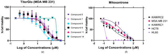 CellTiter-Glo assay against the following cell lines: (a) CellTiter-Glo assay against HCT8 cancer cell lines., (b) CellTiter-Glo assay against HL60 cancer cell lines., (c) CellTiter-Glo assay against KAIMRC1 cancer cell lines, (d) CellTiter-Glo assay against KAIMRC2 cancer cell lines, (e) CellTiter-Glo assay against MDA MB 231 cancer cell lines, and (f) CellTiter-Glo assay of mitoxantrone positive control.